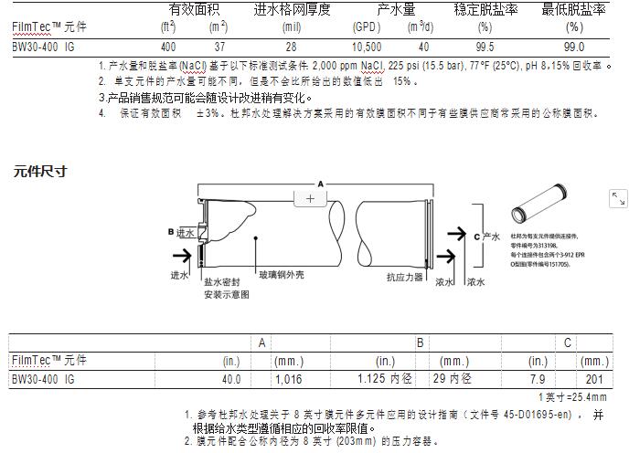 FilmTec™ BW30-400 在要求高品質(zhì)的產(chǎn)水時(shí)是很好的產(chǎn)品選擇。這是市場(chǎng)上第一 款 400 平方英尺的膜元件,繼續(xù)被廣泛用于新設(shè)備和舊系統(tǒng)改造,尤其系統(tǒng)資 金和生產(chǎn)力是考慮因素時(shí)。BW30-400 IG 保持了與 BW30-400 膜元件相同的流量 和脫鹽性能,只不過(guò)它不具備 ANSI 標(biāo)準(zhǔn) 61 認(rèn)證或是 KIWA 認(rèn)證,從而為工業(yè)級(jí) 的應(yīng)用提供了更具成本效益的選擇。