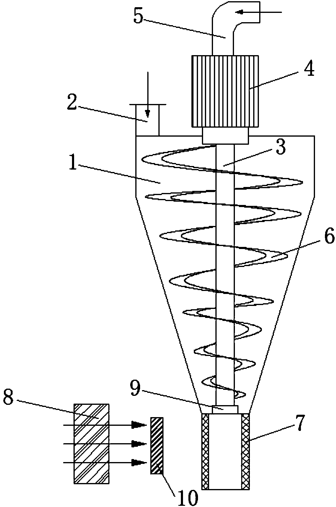 為實現上述目的,本發明提供如下技術方案:一種高效率化學廢水廢渣處理設備,包括反應腔體,所述反應腔體整體呈筒狀,且下部分筒體的內徑長度逐漸減小,所述反應腔體的頂部一側開設有進料口,所述反應腔體的內部中間位置還豎向裝設有轉動軸,所述轉動軸的頂端與外部的轉動電機的轉子同軸連接,且轉動電機的轉子與轉動軸均為中空設計,且相通連接,所述轉動電機的轉子外部開設有除臭凈化液添加口,所述轉動軸的外部周向螺旋安裝有攪拌葉片,所述反應腔體的底部出料口外部裝設有脫水管道,所述脫水管道的側壁為網狀,所述脫水管道的側面裝設有鼓風電機。