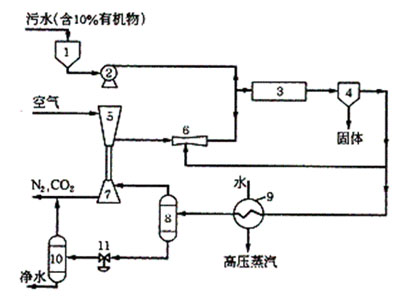1-污水槽;2-污水泵;3-氧化反應(yīng)器;4-固體分離器;5-空氣壓縮機(jī);6-循環(huán)用噴射泵;7-膨脹機(jī)透平;8-高壓氣液分離器;9-蒸汽發(fā)生器;10-低壓氣液分離器; 減壓器