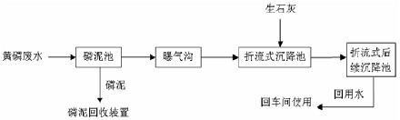 該處理工藝流程為:黃磷廢水 進入磷泥池,通過平流沉降將大部分磷泥分離在磷泥池內,然后進入曝氣溝氧化去除部分元素磷,再進入折流式沉降池的個池中,與投入的生石灰中和,調節(jié)pH 至5 以上,再流入其它沉降池進一步沉降懸浮物,比較后用泵抽回車間循環(huán)使用。處理工藝流程圖如圖1。