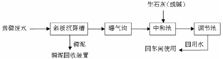 該處理工藝流程為:從制磷車間受磷槽、漂洗精制槽出來的黃磷廢水進入斜板沉降池,進行泥水分離回收磷泥,廢水從斜板沉降池上部溢流出通過曝氣溝氧化去除部分元素磷,再進入中和池與生石灰(或燒堿)中和調節(jié)pH,然后進入調節(jié)池,比較后由泵抽回車間使用。處理工藝流程圖如圖2。
