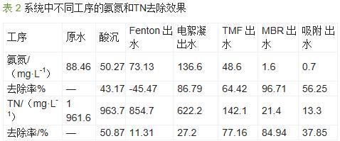 由圖2>可見,氨氮和TN的初始質(zhì)量濃度分別為70~90mg/L和1000~2000mg/L,經(jīng)過酸沉、Fenton氧化、電絮凝、TMF過濾、MBR和吸附等工序后,去除率均達(dá)到95%以上。
