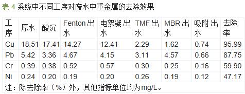 由表4可見,廢水經(jīng)過酸沉、Fenton氧化、電絮凝工序后,重金屬略有降低。經(jīng)過TMF固液分離系統(tǒng)后,Cu的去除效果比較好,去除率達(dá)到87%。經(jīng)過MBR生化處理后,廢水中重金屬Cu、Pb、Cr、Ni的質(zhì)量濃度分別減少至0.74、0.66、0.25、0.19mg/L,再進(jìn)一步吸附后,4種重金屬的去除率分別達(dá)到95.99%、87.75%、59.90%、47.14%,其出水濃度均達(dá)到(GB21900—2008)表3標(biāo)準(zhǔn)的要求。具體參見http://www.dowater.com更多相關(guān)技術(shù)文檔。