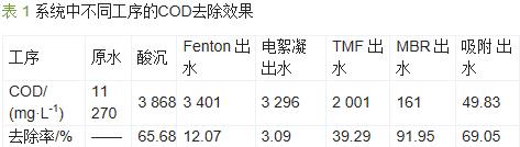 系統(tǒng)連續(xù)運(yùn)行期間,原廢水COD為8000~18000mg/L,經(jīng)過酸沉、Fenton氧化、電絮凝、TMF過濾和MBR等工序后,COD去除率達(dá)到85%~90%,進(jìn)一步吸附后COD的質(zhì)量濃度降低至50mg/L以下。
