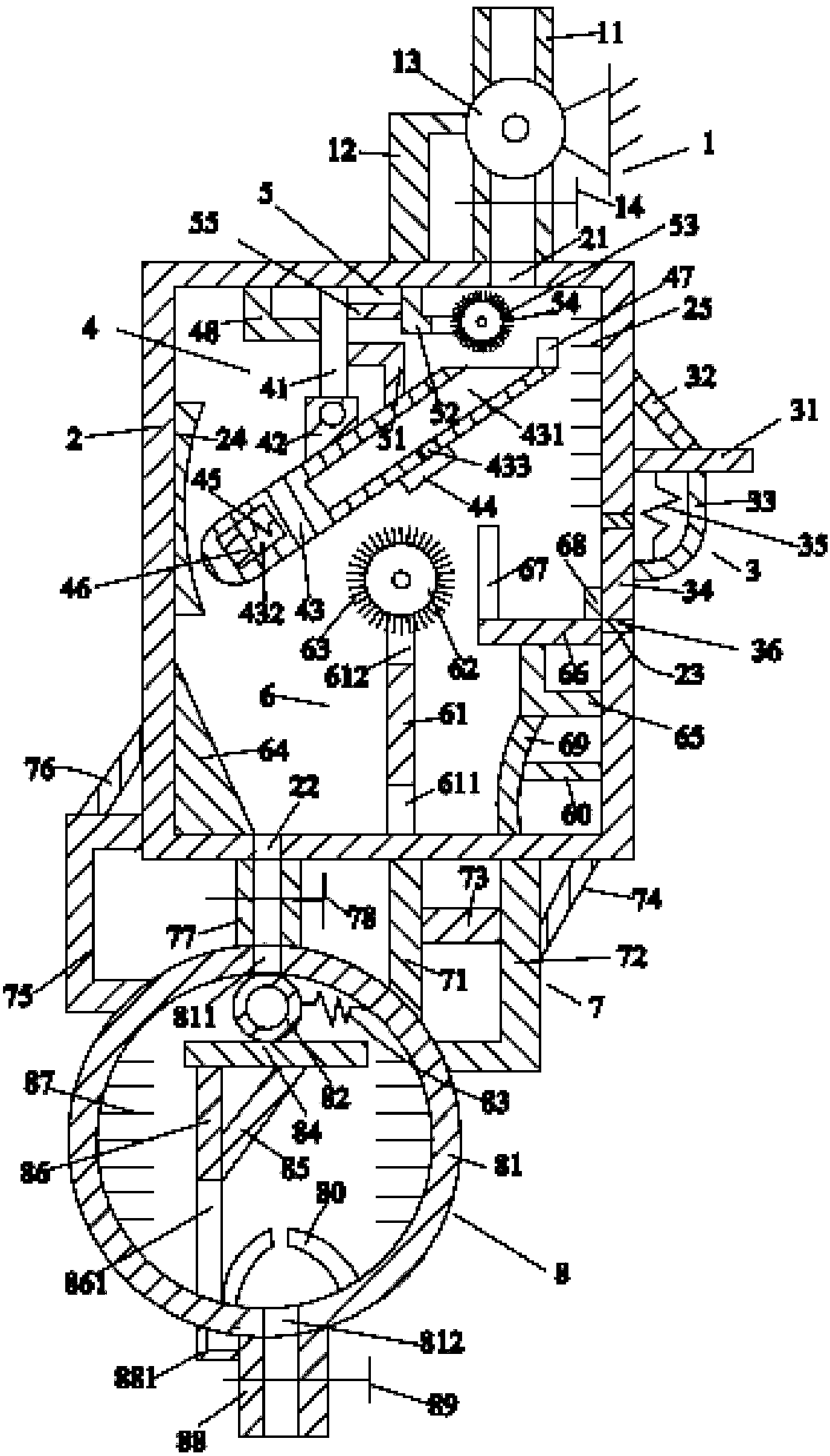 1.一種污水初級(jí)過濾凈化系統(tǒng),包括抽水裝置(1)、位于所述抽水裝置(1)下方的框體(2)、設(shè)置于所述框體(2)上的擋板裝置(3)、收容于所述框體(2)內(nèi)的沉淀裝置(4)、位于所述沉淀裝置(4)上方的滾輪裝置(5)、位于所述沉淀裝置(4)下方的過濾裝置(6)、位于所述框體(2)下方的連接裝置(7)及位于所述連接裝置(7)下方的第二過濾裝置(8),其特征在于:所述抽水裝置(1)包括管道(11)、設(shè)置于所述管道(11)上的水泵(13)、位于所述水泵(13)左側(cè)的支架(12)及設(shè)置于所述管道(11)上的閥門(14),所述擋板裝置(3)包括橫桿(31)、位于所述橫桿(31)上方的斜桿(32)、位于所述橫桿(31)下方的彈性桿(33)、位于所述彈性桿(33)左側(cè)的擋板(34)、設(shè)置于所述彈性桿(33)上的彈簧(35)、設(shè)置于所述擋板(34)上的密封環(huán)(36),所述過濾裝置(6)包括支撐桿(61)、設(shè)置于所述支撐桿(61)上端的第二滾輪(62)、設(shè)置于所述第二滾輪(62)上的第二刷毛(63)、位于所述支撐塊(61)左側(cè)的集中塊(64)、位于所述支撐桿(61)右側(cè)的第五支架(65)、位于所述第五支架(65)上方的橫板(66)、位于所述橫板(66)上方的第三過濾網(wǎng)(67)、位于所述橫板(66)上方的限定塊(68)、位于所述第五支架(65)下方的彎曲桿(69)及位于所述彎曲桿(69)右側(cè)的第三橫桿(60)。
