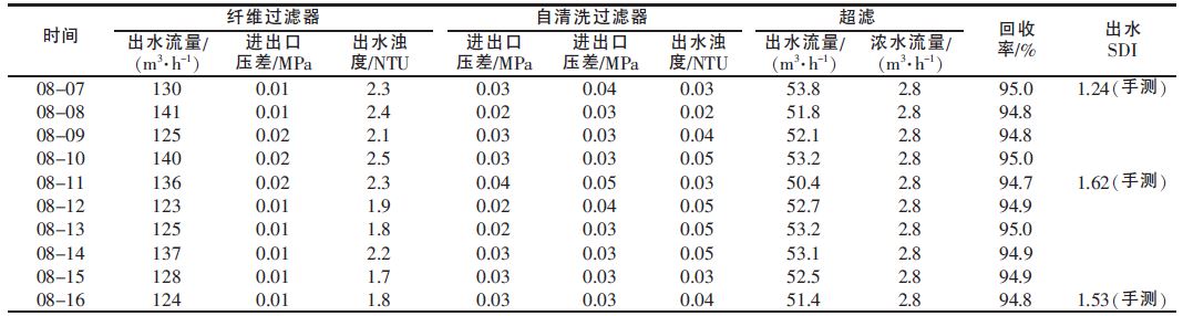 由表 1 可見(jiàn),預(yù)處理系統(tǒng)出水濁度為0.02~ 0.05 NTU,SDI<2,完全滿(mǎn)足反滲透入水要求。