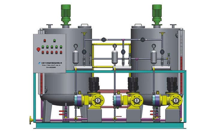 一般為一箱兩泵一臺電動攪拌器組成一整套系統,亦可根據用戶要求,構成兩箱兩泵,兩箱多泵,多箱多泵多種結構?捎糜谝阂骸⒐桃、氣液藥劑溶液的配制、定量投加。