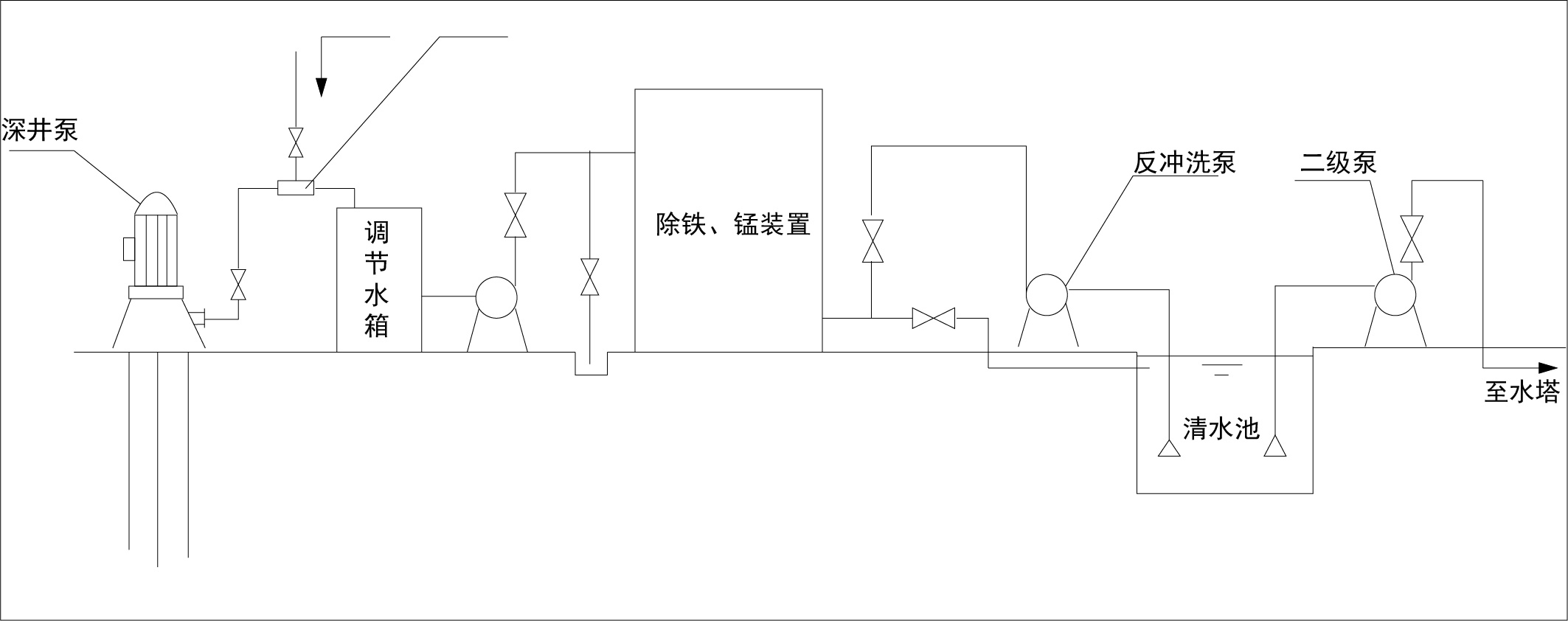除鐵錳裝置由本體、引射曝氣裝置、中間加壓泵、反沖泵、控制系統、供水泵及管網系統組成。