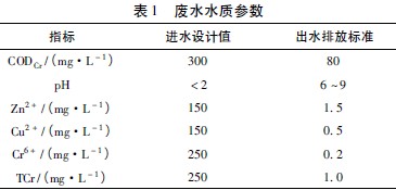 該工程的處理廢水為電鍍綜合廢水。改造工程的設(shè)計(jì)水量為500m3/d (其中含氰廢水100m3/d) ,水質(zhì)水量波動(dòng)較大(水量日變化系數(shù)為3,進(jìn)水COD 范圍100~300mg/L) 。具體參數(shù)見(jiàn)表1。