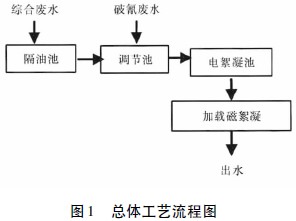 電鍍綜合廢水首先經(jīng)過(guò)隔油池隔油后進(jìn)入調(diào)節(jié)池與破氰后的廢水混合調(diào)節(jié)pH 值3~4,泵入電絮凝池,利用高頻高壓脈沖電源在水中通電發(fā)生電化學(xué)反應(yīng),產(chǎn)生氧化、還原、絮凝和氣浮等四種效應(yīng),降解COD 和形成金屬氫氧化物,再進(jìn)入加載磁絮凝池調(diào)整pH 到8. 5~9,加載磁粉加快泥水分離,上清液水質(zhì)達(dá)到出水排放標(biāo)準(zhǔn)。