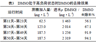 在正式期的第11天~第54天,持續(xù)的進(jìn)水DMSO高負(fù)荷對(duì)模試裝置的運(yùn)行形成沖擊,當(dāng)DMSO處于高負(fù)荷狀態(tài)時(shí)DMSO的去除效果見(jiàn)表3。