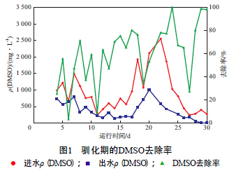 馴化期的DMSO去除率見(jiàn)圖1。由圖1可見(jiàn):隨馴化時(shí)間的延長(zhǎng),DMSO的去除率總體呈上升趨勢(shì);馴化第29天,DMSO去除率達(dá)98.5%,表明裝置運(yùn)行29 d時(shí)MBR內(nèi)的污泥已馴化成功。