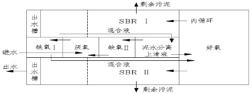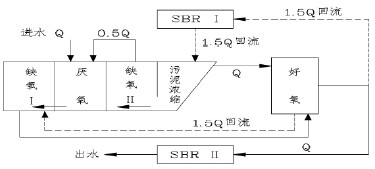 運行過程中,污水首先進入厭氧池,與來自泥水分離池、并經缺氧池Ⅱ反硝化后的混合液混合,使聚磷菌在此充分釋磷,然后進入缺氧池Ⅰ繼續進行反硝化。反硝化后的混合液進入好氧池,完成有機物去除、硝化和聚磷菌的攝磷等功能,比較后混合液進入SBR 池Ⅰ或SBR 池Ⅱ,在此進行比較后的處理及泥水分離,并排出澄清出水(如圖2 所示) 。除兩個SBR 池外,工藝中其余各池均處于恒水位、連續運行的狀態,其運行操作方式基本固定。而對SBR 池而言,當其中一個SBR 池作為比較后處理工段時,另一個SBR 池則在1.5Q 的回流量(至泥水分離池) 的條件下以硝化、反硝化的模式運行或進行靜止預沉淀。運行期間始終進行污泥回流,并首先進入泥水分離池分離濃縮,上清液進入好氧池,濃縮污泥進入缺氧池Ⅱ,進行反硝化,并消耗掉污泥中DO 和硝酸鹽,為隨后在厭氧池中的釋磷過程創造有利條件。