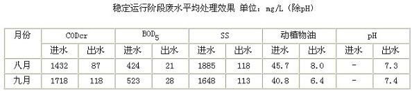 從上表可知,在穩定運行期間, CODcr的平均去除率為93.5%;BOD5的平均去除率為94.8%; SS的均去除率為93.5%;動植物油的平均去除率為83.4%。廢水處理系統排放水中pH值、動植物油、CODcr、BOD5、SS六項指標均達到GB8978-1996《污水綜合排放標準》表4中三級標準。