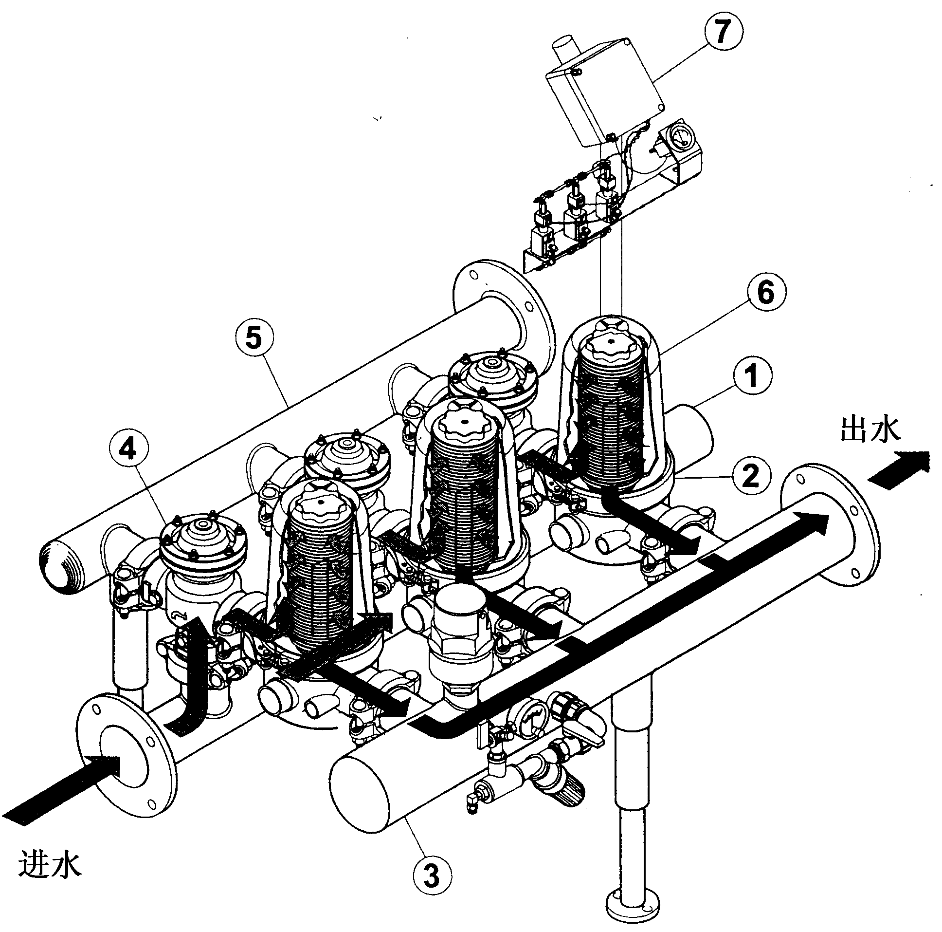 反沖洗循環由控制器(7)上的壓差數據控制,并通過時間控制器的信號開啟和關閉沖洗閥(4)?刂破(7)控制沖洗過程,以使在同一時間僅有一只過濾單元處于反沖洗狀態,同時其他過濾單元繼續向系統中提供干凈的清水。沖洗過程持續一定時間后自動停止,持續的時間可以預先在控制器上設定。